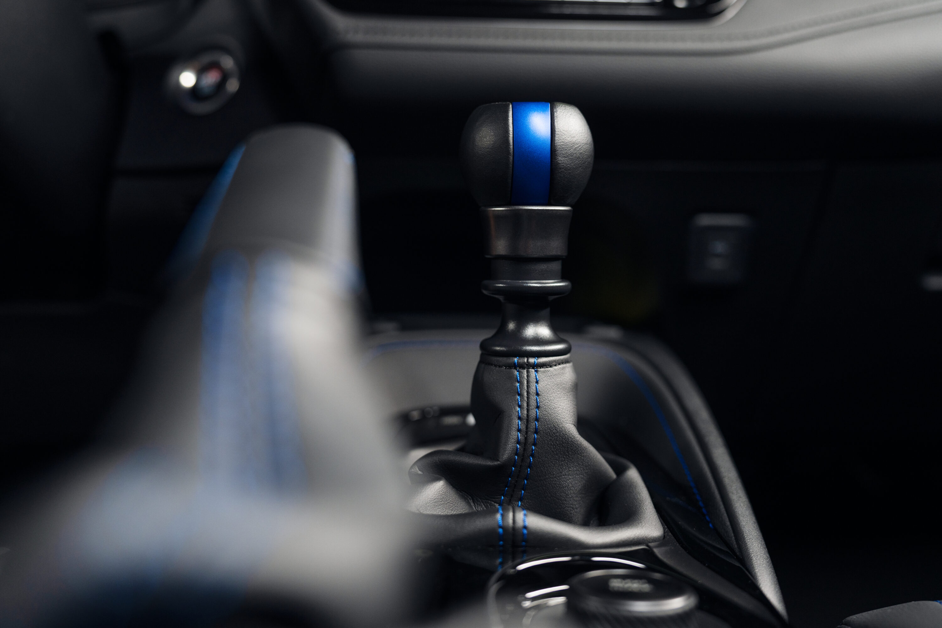 - Leather-wrapped shift knob with blue stripe and forged carbon accents
